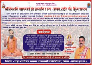 बांकीमोंगरा (कोरबा) :— धर्मनगरी बांकीमोंगरा के सोमवारी बाजार क्षेत्र स्थित भुतेश्वरनाथ मंदिर के समीप शिव शक्ति प्रांगण में आगामी दिनों में श्री शिव शक्ति महायज्ञ एवं विराट संत सम्मेलन का भव्य आयोजन किया जा रहा है। इस धार्मिक अनुष्ठान में कथा–प्रवचन, राष्ट्रीय गीत, भजन–कीर्तन एवं हिंदुत्व जागरण से जुड़े विविध कार्यक्रम होंगे।