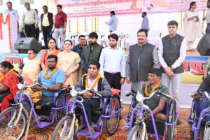 मुख्य अतिथि के आसंदी से जिला पंचायत अध्यक्ष अरूण सिंह चौहान ने कहा कि दिव्यांगजन खेल, शिक्षा, अभिनय से लेकर हर क्षेत्र में अपनी प्रतिभा का लोहा मनवा रहे हैं। दिव्यांगजनों के कल्याणार्थ एवं पुनर्वास हेतु राज्य शासन द्वारा कई योजनाएं एवं कार्यक्रम संचालित किए जा रहे हैं। प्रदेश सरकार दिव्यांगजनों के कल्याण तथा हित में निरंतर तथा बेहतर कार्य कर रही है। यह हमारा सौभाग्य है कि हम इस कार्यक्रम में उपस्थित होकर इन्हें प्रोत्साहित कर रहे हैं। कार्यक्रम में मुख्य अतिथि के हाथों 133 दिव्यांग हितग्राहियों को सहायक उपकरण दिया गया। इसमें 60 हितग्राहियों को मोटराईज्ड ट्रायसायकल, 29 को ट्रायसायकल, 13 को श्रवण यंत्र, 20 को व्हीलचेयर, 8 को बैसाखी, 8 को वाकिंग छड़ी, 6 को सुगम्य केन, 5 को कृत्रिम अंग, 3 को स्मार्ट फोन, 5 को कैलिपर्स एवं 3 हितग्राहियों को रोलेटर वाकर सहायक उपकरण का वितरण जनरल इन्शुरेन्स कम्पनी के सीएसआर मद से किया गया एवं दिव्यांगजनों द्वारा राष्ट्रीय स्तर के खेल-कूद में मैडल प्राप्त करने वाले 9 दिव्यांगों को तथा विगत दिनों में खेलकूद में उत्कृष्ट प्रदर्शन करने वाले 70 दिव्यांगों के साथ-साथ सांस्कृतिक कार्यक्रम में प्रस्तुत करने वाले 20 दिव्यांगजनों को प्रतीक चिन्ह एवं प्रमाण पत्र प्रदाय किया गया। इसी प्रकार विभिन्न दिव्यांग संस्थाओं एवं विभागीय क्षेत्र में उत्कृष्ट कार्य करने वाले 45 कर्मचारियों को भी प्रमाण पत्र प्रदाय किया गया। इस अवसर पर दिव्यांग बच्चों ने रंगारंग सांस्कृतिक कार्यक्रमों की प्रस्तुती दी।