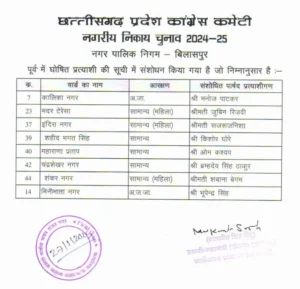 बिलासपुर :— सोमवार शाम को बड़ी माथा पच्ची के बाद कांग्रेस ने बिलासपुर नगर निगम पार्षदों की सूची जारी किया। लेकिन देर रात्रि करीब 11 बजे पहली सूची के खिलाफ संशोधन सूची भी जारी कर दिया। संशोधन सूची देखने के बाद हटाए चेहरों को बहुत दुख हुआ है। बताया जा रहा है कि संशोधन सूची में जिन नामों को टिकट देना का एलान किया गया है। दरअसल यह नाम पहली सूची में शामिल थे। लेकिन गुटबाजों ने जोड़तोड़ कर अपने लोगों का नाम डलवा लिया। जानकारी मिलते ही प्रदेश के दिग्गज नेता बिफर गए….। अन्ततः मलकीत सिंह गैदू को संशोधन सूची जारी करने को मजबूर होना पड़ा। बताते चलें कि पहली सूची से निकाले गए कई लोगों को तो बी वन फार्म भी मिल चुका था।