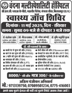 बिलासपुर :— शहर में प्रसिद्धि प्राप्त वंदना मल्टीस्पेशलिस्ट हॉस्पिटल में 11 मई दिन रविवार को सुबह 9 से दोपहर 3 बजे तक स्वास्थ्य जाँच शिविर का आयोजन किया जा रहा है. शिविर में सभी प्रमुख जाँच 300 रूपये सुपर स्पेशलिस्ट डॉक्टरों द्वारा किया जाएगा, जिसकी वास्तविक जाँच शुल्क 8000 रूपये है. शिविर में एमबीबीएस, एमडी (मेडिसिन) सीनियर कंसलेटिंग फिजिशियन डॉ. चंद्रशेखर उइके, एमबीबीएस, एमएस, एमसीएच (न्यूरोसर्जन) डॉ. नीरज प्रसाद, एमबीबीएस, एमडी (मेडिसिन), (एमबीबीएस, डीएनबी) प्रसूति एवं स्त्री रोग विशेषज्ञ डॉ. सृष्टि चतुर्वेदी गुप्ता उपस्थित रहेंगे. शिविर में अग्रिम पंजीयन कराने के लिए इन नंबरों पर संपर्क करें. मोबाइल नंबर -9713139750, 07089501234, 0775416003 पर पंजीयन करा सकते है. मरीज अपने साथ पुराने इलाज की पर्ची एवं पुराने रिपोर्ट साथ लेकर आवें. ज्ञात हो की मंगला चौक स्थित वंदना हॉस्पिटल में समय-समय पर एस तरह के स्वास्थ्य शिविर का आयोजन होते रहता है।