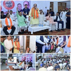 बिलासपुर :— उप मुख्यमंत्री अरुण साव ने रायपुर के भनपुरी स्थित पाटीदार समाज भवन में स्थानीय लोगों और युवाओं के साथ प्रधानमंत्री श्री नरेन्द्र मोदी के मासिक रेडियो कार्यक्रम ‘मन की बात’ की 123वीं कड़ी का प्रसारण सुना। प्रधानमंत्री ने आज की ‘मन की बात’ में देशवासियों से अंतरराष्ट्रीय योग दिवस की सफलता, देश-विदेश में बने कीर्तिमानों, आपातकाल के दौरान लोकतंत्र की हत्या के काले अध्याय जैसे विषयों पर अपने विचार साझा किए। विधायक श्री मोतीलाल साहू ने भी पाटीदार समाज भवन में ‘मन की बात’ का प्रसारण सुना।