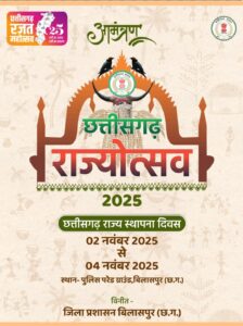 बिलासपुर // छत्तीसगढ़ राज्य स्थापना दिवस के अवसर जिला स्तरीय राज्योत्सव का भव्य आयोजन पुलिस परेड मैदान में 2 नवम्बर से 4 नवम्बर 2025 तक किया जाएगा। राज्योत्सव के पहले दिन केंद्रीय आवासन एवं शहरी विकास राज्य मंत्री श्री तोखन साहू कार्यक्रम का शुभारंभ करेंगे। कार्यक्रम की अध्यक्षता उप मुख्यमंत्री श्री अरूण साव करेंगे। विशिष्ट अतिथि के तौर पर विधायक सर्वश्री श्री धरमलाल कौशिक, श्री अमर अग्रवाल, श्री धर्मजीत सिंह, श्री सुशांत शुक्ला, श्री दिलीप लहरिया, श्री अटल श्रीवास्तव, क्रेडा के अध्यक्ष श्री भूपेन्द्र सवन्नी, छत्तीसगढ़ पाठ्य पुस्तक निगम के अध्यक्ष श्री राजा पाण्डेय, महापौर श्रीमती पूजा विधानी, जिला पंचायत अध्यक्ष श्री राजेश सूर्यवंशी, नगर निगम के सभापति श्री विनोेद सोनी शामिल होंगे।
